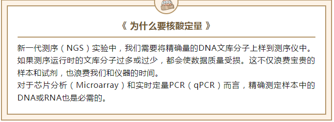 新一代測(cè)序(NGS)實(shí)驗(yàn)中,我們需要將精確量的DNA文庫(kù)分子上樣到測(cè)序儀中。如果測(cè)序運(yùn)行時(shí)的文庫(kù)分子過(guò)多或過(guò)少,都會(huì)使數(shù)據(jù)質(zhì)量受損。這不僅浪費(fèi)寶貴的樣本和試劑,也浪費(fèi)我們和儀器的時(shí)間。對(duì)于芯片分析(Microarray)和實(shí)時(shí)定量PCR(qPCR)而言,精確測(cè)定樣本中的DNA或RNA也是必需的。